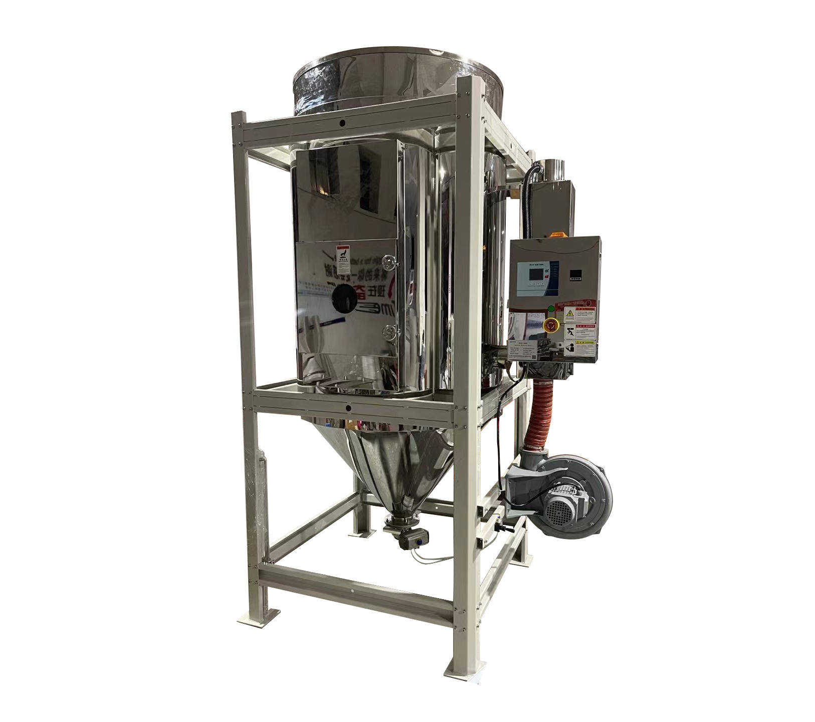 팬에 의해 부는 바람은 전기로 가열된 후 고온의 건조한 열풍이 됩니다. 뜨거운 공기는 스크린 프로텍터와 천공된 스크린을 통해 건조 배럴에 고르게 분산될 수 있습니다. 건조기에는 열풍 회수 장치가 장착될 수 있습니다. 불어넣은 공기는 반환 공기에 의해 여과된 후 건조 팬으로 들어가 폐쇄 루프를 형성하고 전기를 절약합니다.